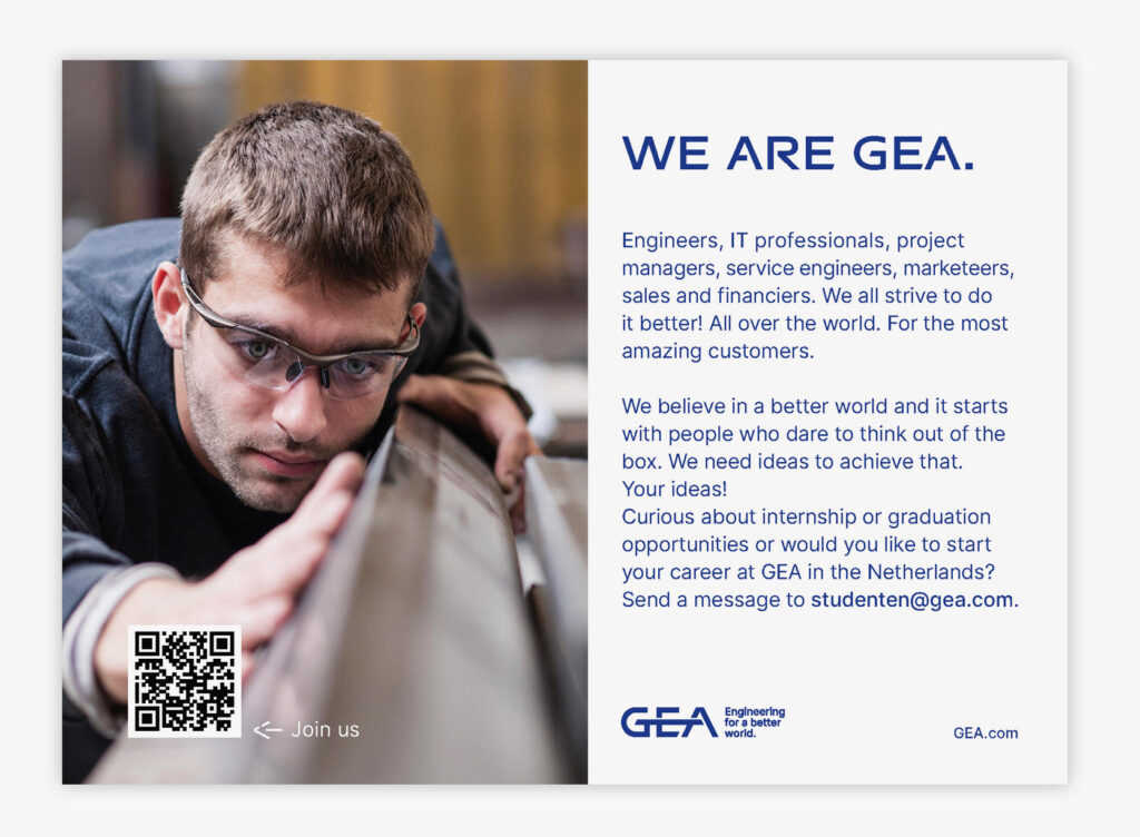 Een wervingscampagne voor enthousiaste jongeren die hun carrière willen starten bij GEA. Jongeren die zich bewust zijn van de veranderende wereld en de overbelaste aarde. Bij GEA kunnen ze er daadwerkelijk iets aan doen.